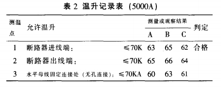 表2是温升实验室的质检人员按照国家规范GB7251.1-1997的有关条款对该样柜进行温升实验,对整个母线槽系统的关键处和搭接面进行丈量(测得部分温升记载)